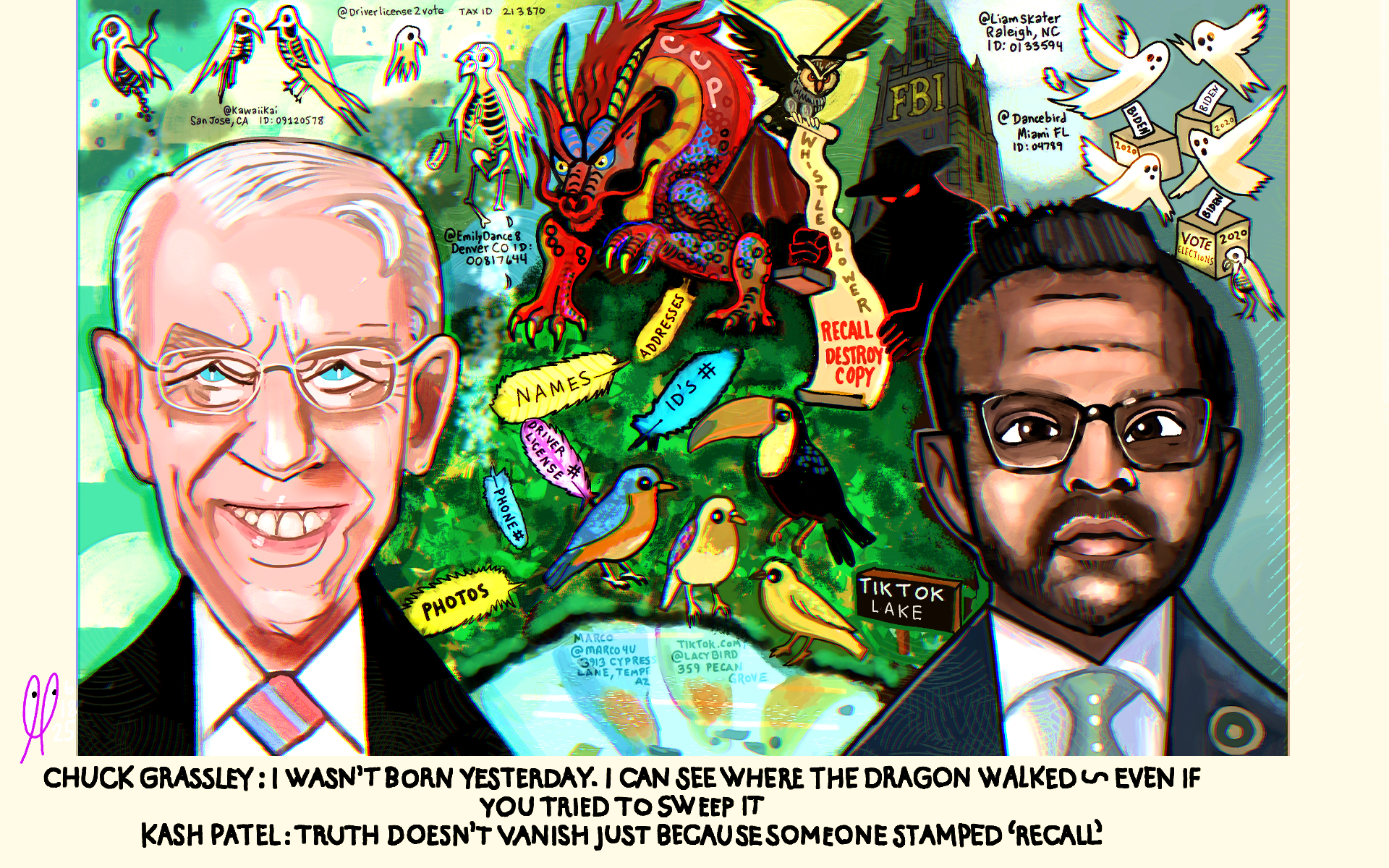 Senator Chuck Grassley squints at the vanishing footprints and Kash Patel says TRUTH DOESNT VANISH just because someone stamped RECALL.