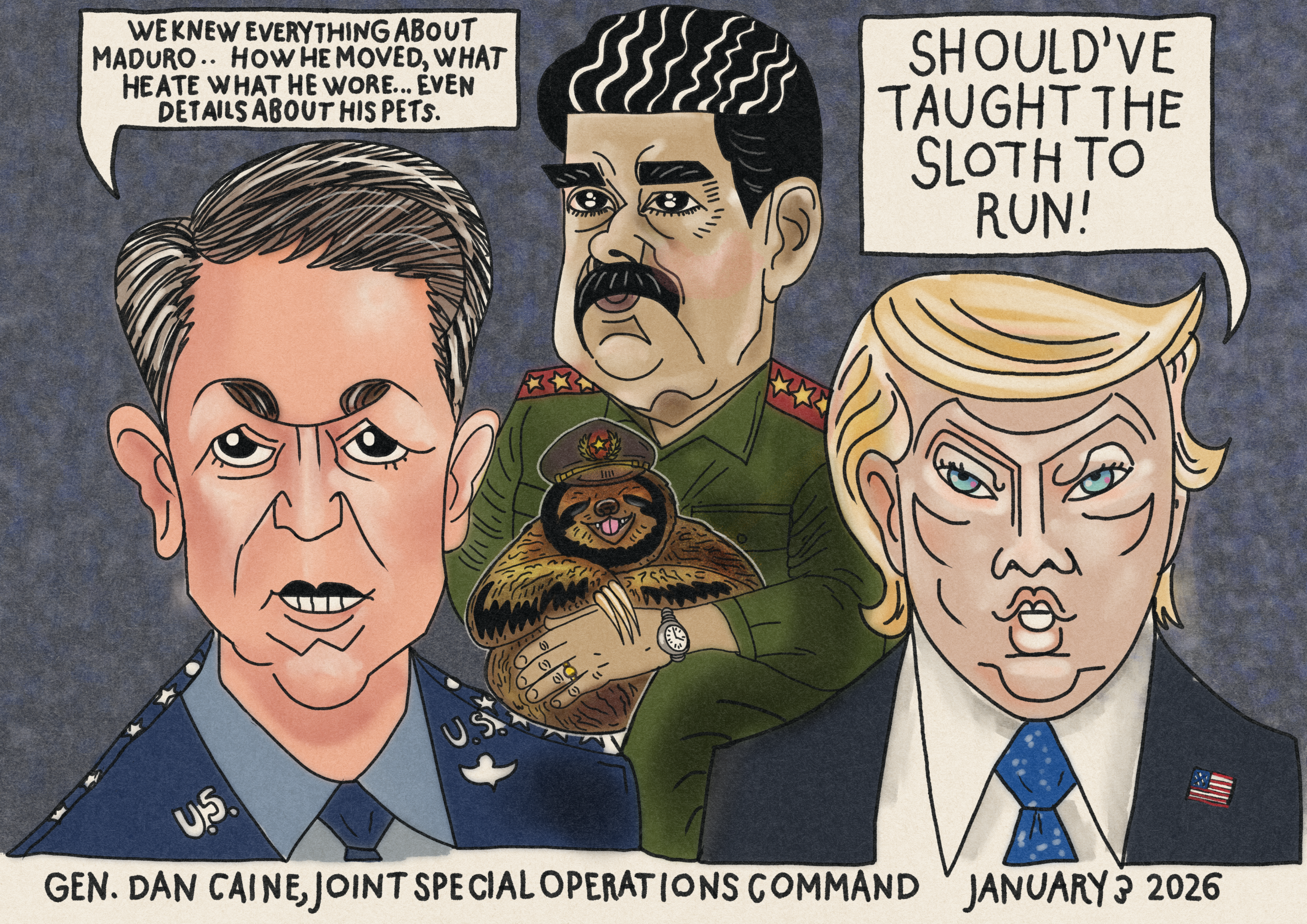 It was oddly specific and I couldn’t stop thinking about it. So in this cartoon, I imagined the pet: a slow, smug little sloth in a dictator’s cap. And of course, I gave President Trump the punchline: