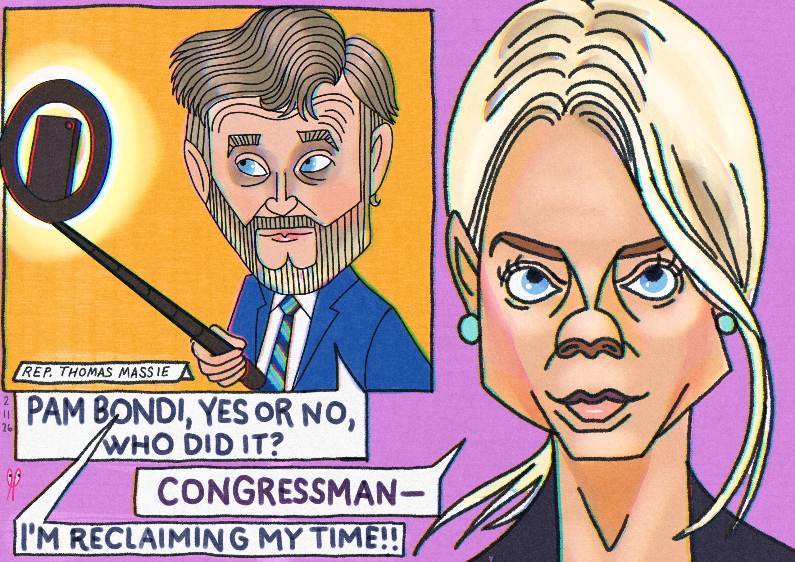 In the cartoon, Massie’s got the selfie stick for a reason: the modern hearing often feels like it’s performed for the phone, not for the truth. Pam Bondi is very Partisan in her answers.