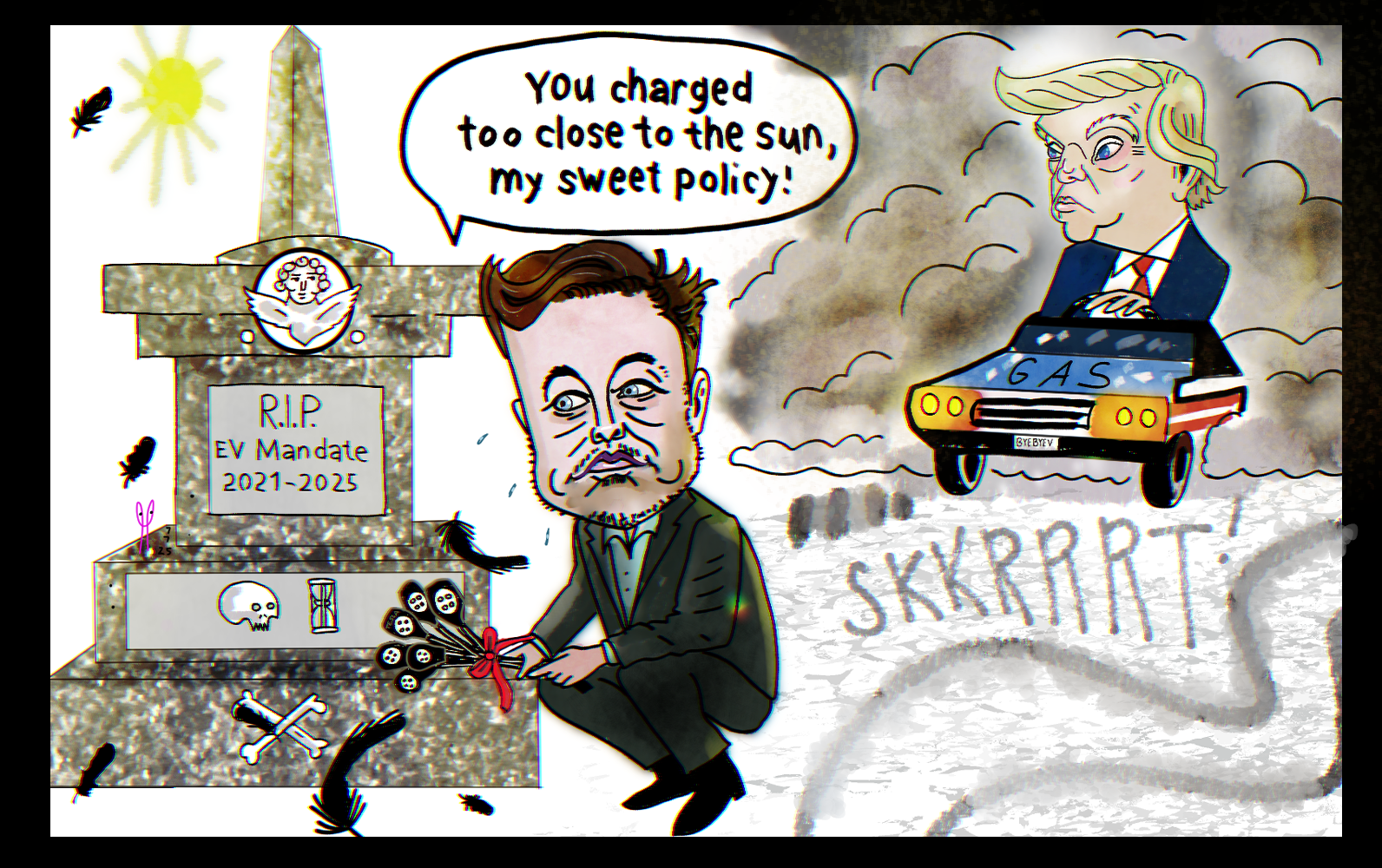 This cartoon captures Elon Musk kneels solemnly beside the grave of the EV Mandate now a casualty of shifting political winds. With poetic grief, he lays flowers at the tombstone, whispering, “You charged too close to the sun, my sweet policy.” ELON is holding a bouquet of electric car adapters.