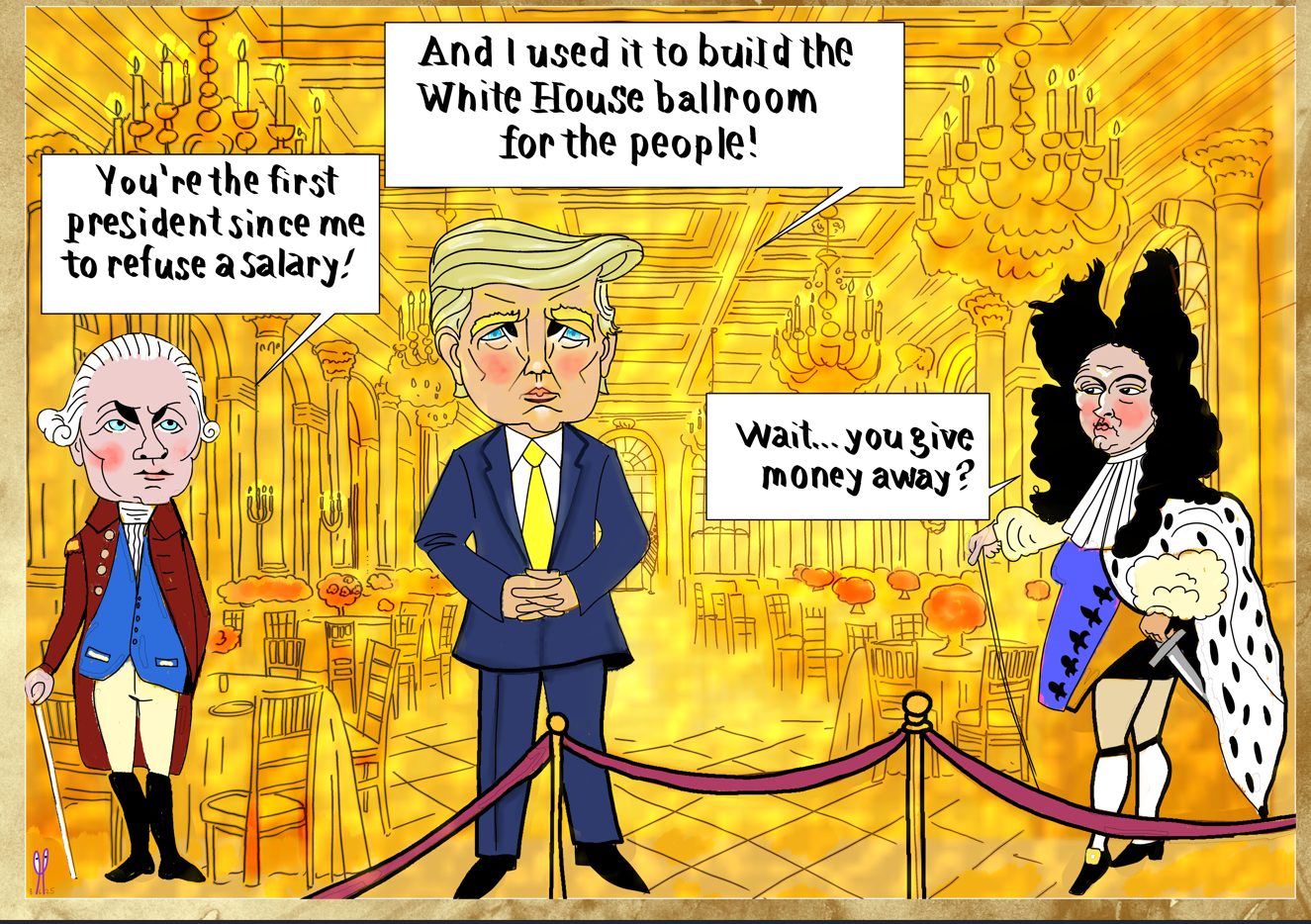 In this piece, President Trump joins George Washington as the only presidents to have refused a salary a rare act of patriotic sacrifice. Meanwhile, Louis XIV, the original Sun King, peers in with confused disbelief: