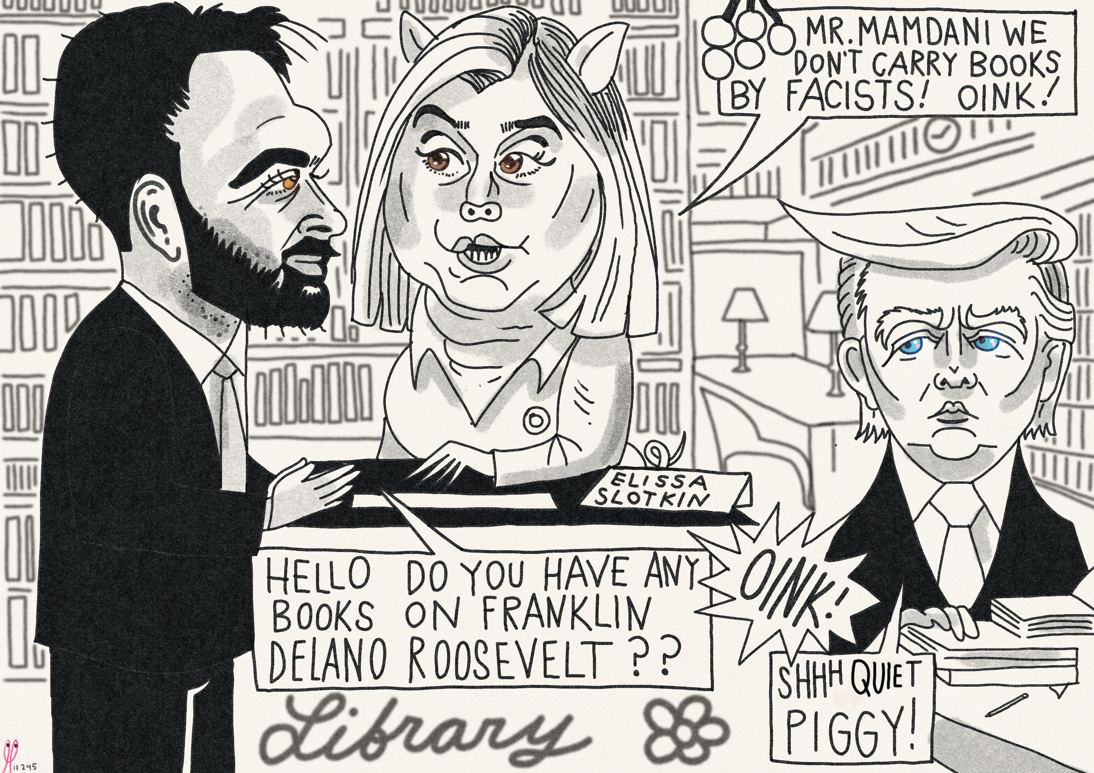 In today’s cartoon, I collapse these two scenes into one: a pig-faced Slotkin, now librarian of the new regime, sneering at a curious Mamdani who dares to ask about Franklin Delano Roosevelt a Democrat, mind you, but also a wartime nationalist who served MORE TERMS than allowed. His presidency broke the two-term tradition. Slotkin responds with: “We don’t carry books by fascists. Oink!” From the back corner of the library, Trump looks up from his book and delivers it again: