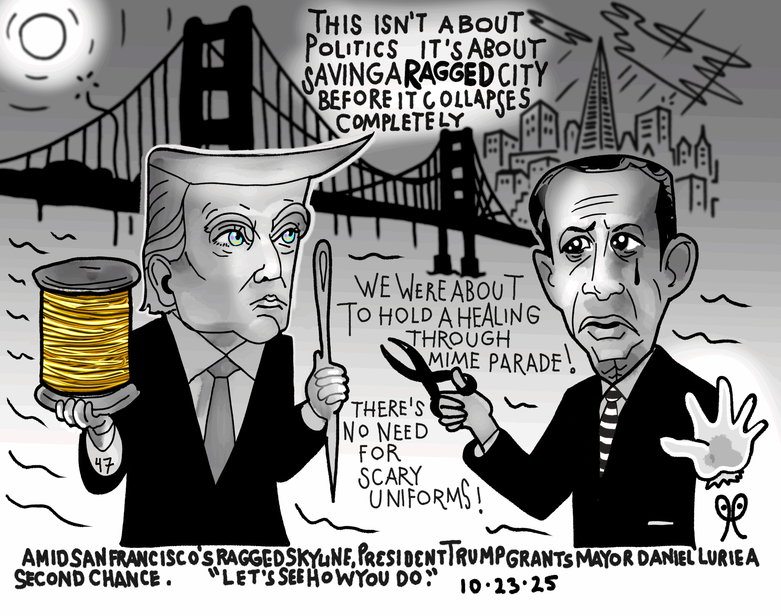 President Trump, with a spool of GOLD, meets Mayor Daniel Lurie, mime befoe San Francisco’s unraveling ragged skyline.