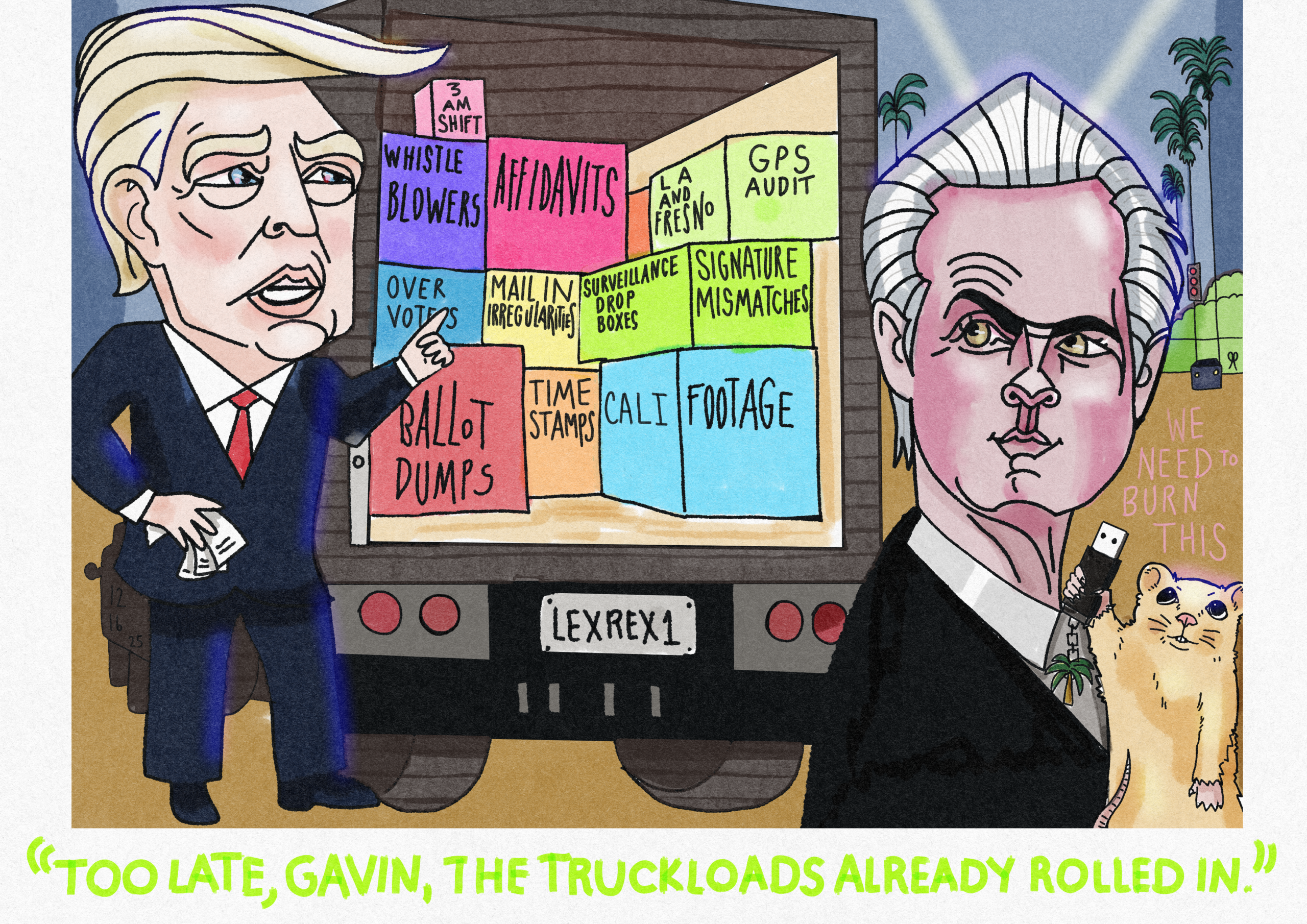 That’s the line I gave Donald Trump in my latest political cartoon a response to his speech, that he holds “truckloads” of evidence exposing rigged elections in California. At the center of his accusation: Gavin Newsom