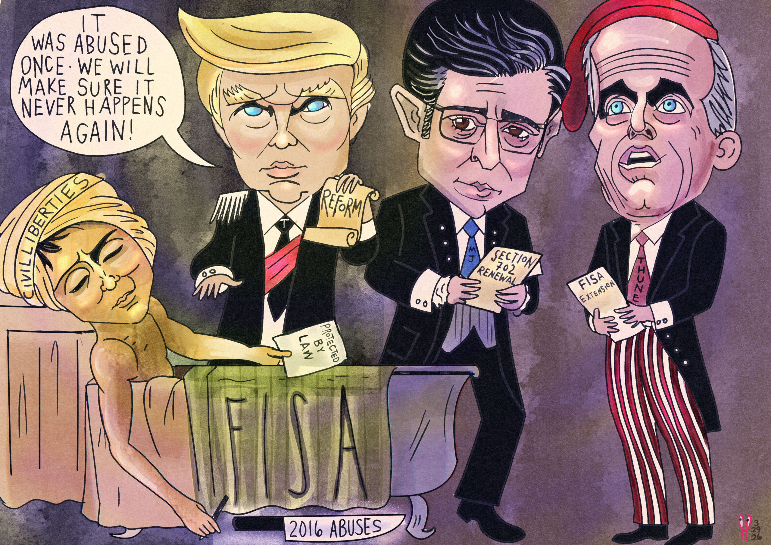 In an era where surveillance, national security, and civil liberties intersect, political art offers a powerful way to interpret complex policy debates. This neoclassical political cartoon explores the tension surrounding FISA Section 702, drawing inspiration from classical European painting to frame a modern constitutional issue.
